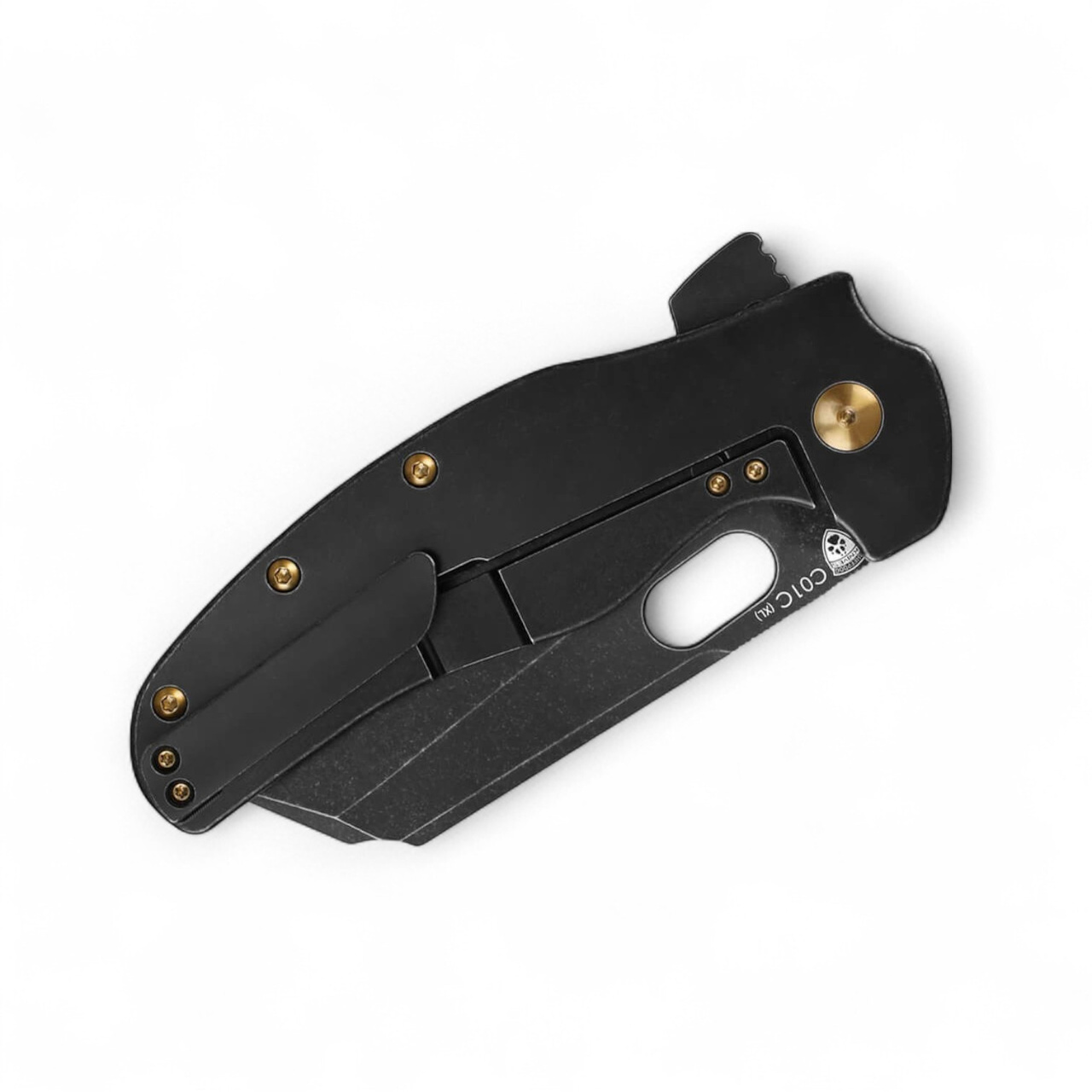 The XL version of the Sheepdog model is equipped with a robust sheepfoot blade made of CPM-S-35VN powder steel. The liner lock system locks the blade securely and reliably, and the thumb hole allows for intuitive opening. The black titanium handle has a pronounced ergonomic shape and provides a secure grip even during demanding work. The gold screws create a striking contrast to the knife's all-black appearance. Equipped with a tip-up clip (right) for comfortable carrying.