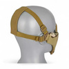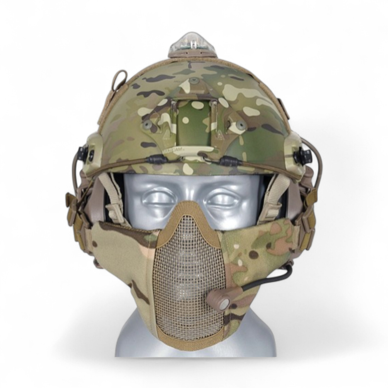 The Half Face Mesh Mask 2.0 from WOSPORT is a protective mask for the lower part of the face, ideal for tactical activities such as airsoft, paintball, or mil-sim training. Version 2.0 offers added comfort and protection, including ear coverage, and is compatible with most protective eyewear or tactical eye masks.