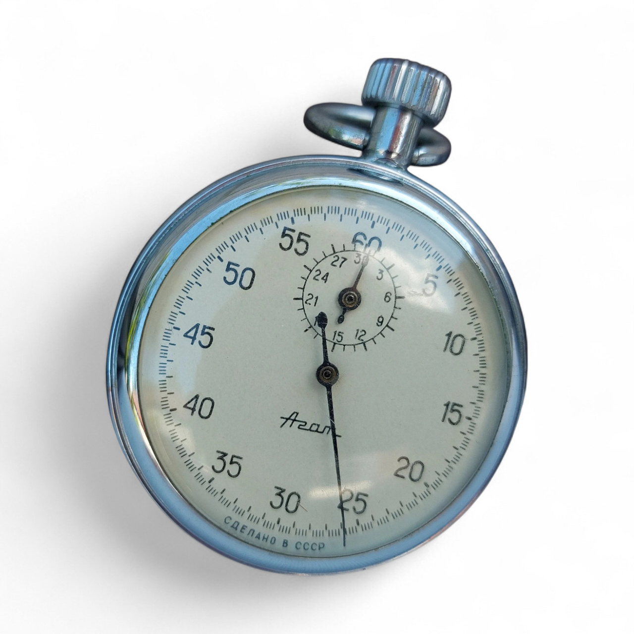 Vintage AGAT mechanical stopwatch, manufactured in the 1970s in the former Soviet Union by the Agat watch factory in Zlatoust. Model with 15 jewels, manual winding mechanism, and analog display.