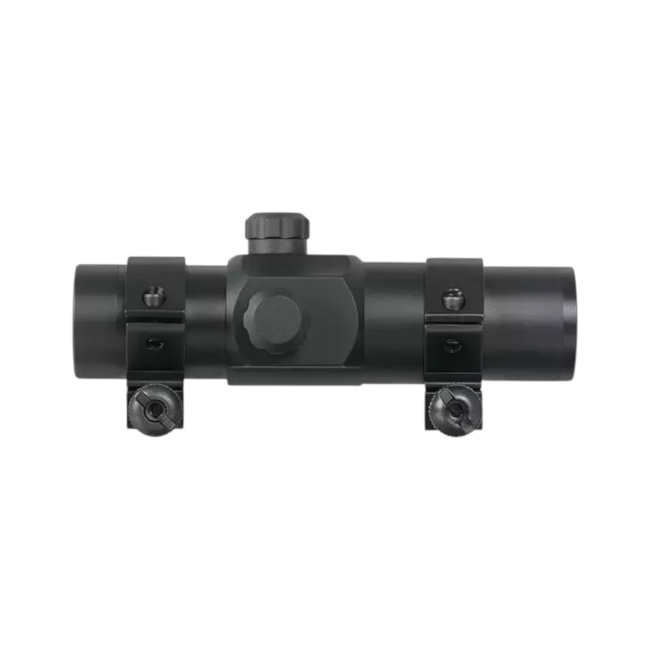 Features 10 levels of red dot brightness adjustment. Compatible with all standard Picatinny/Weaver rails. Powered by a CR2032 battery (not included).