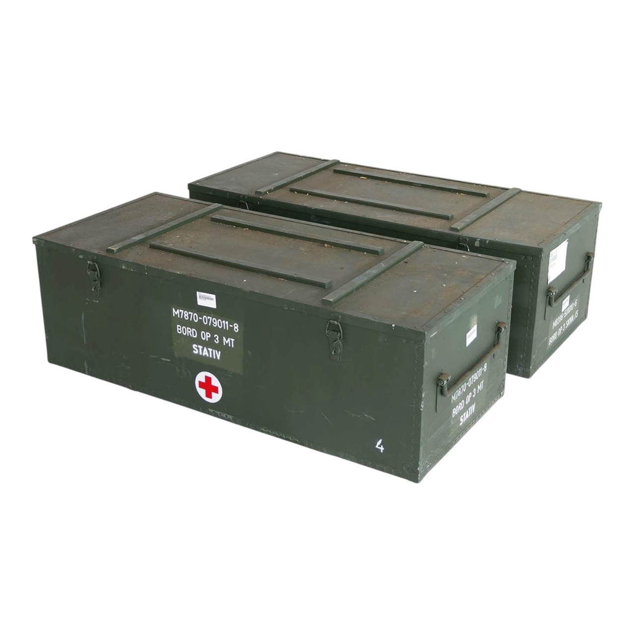 This military operating table, model 3 MT, manufactured for the Swedish Defense Forces, is a vintage military surplus from 1974, kept in excellent condition and unused. Compact and portable, the table can be disassembled and easily transported in the two included wooden crates.