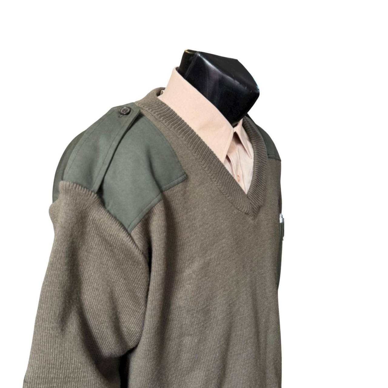 Romanian military sweater from the Romanian Army surplus, designed for city and service wear. The classic model, with a V-neck, shoulder epaulettes, and chest pocket, combines functionality with authentic military style.