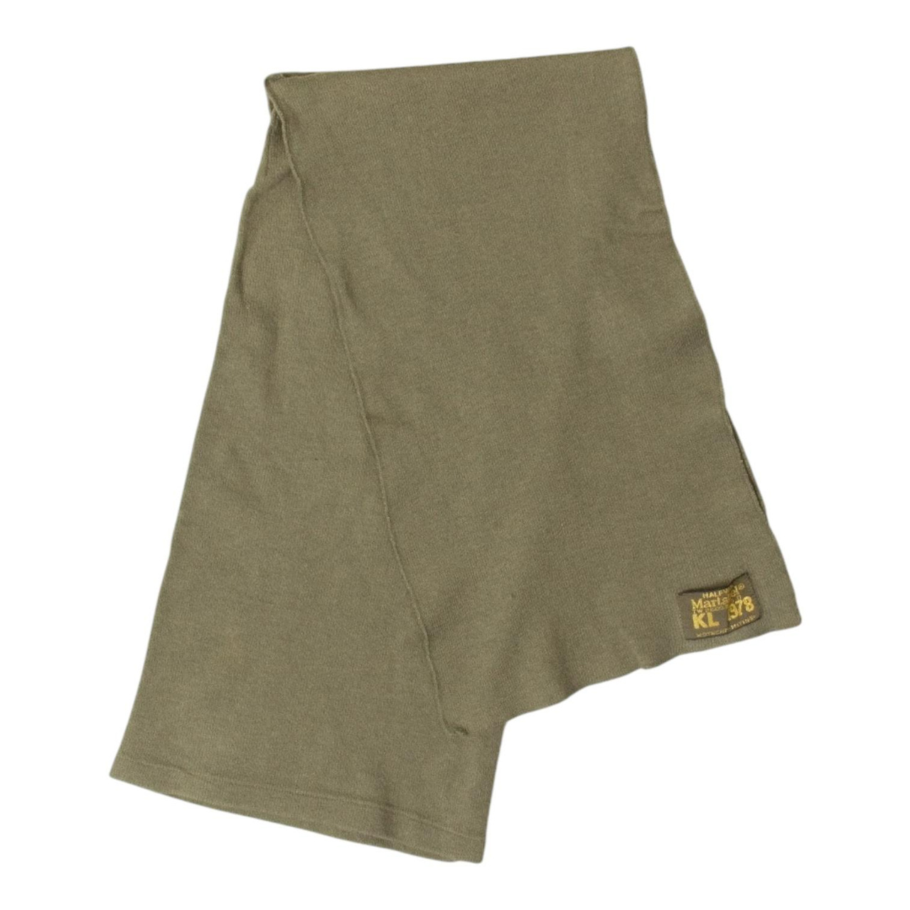 Vintage scarf from the Dutch Army surplus, manufactured in the 1970s. Made from a wool and cotton blend in olive green. The scarf features a half-tubular, half-open design, ideal for extremely cold temperatures and can be worn in multiple ways.