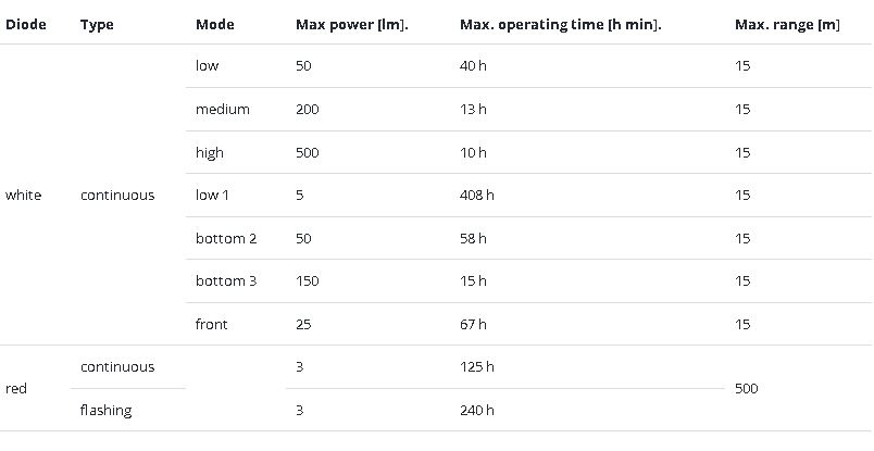 Diffused light: 50 / 200 / 500 lumens (up to 15 m range)