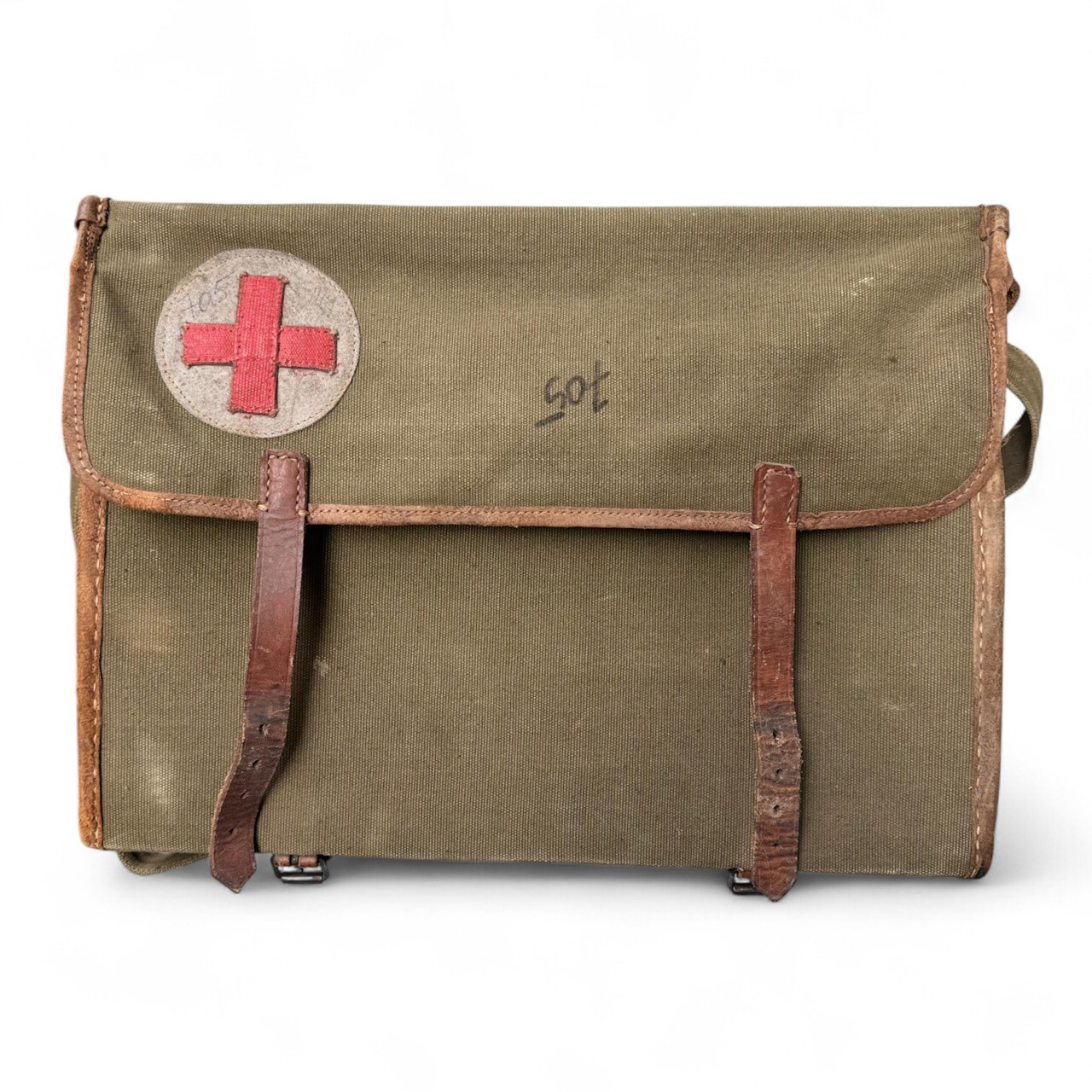 Original sanitary equipment bag used during the communist period by the Romanian Patriotic Guards and the Red Cross. Made from durable materials with a classic military design, this piece represents an authentic collectible item from the R.S.R. era.