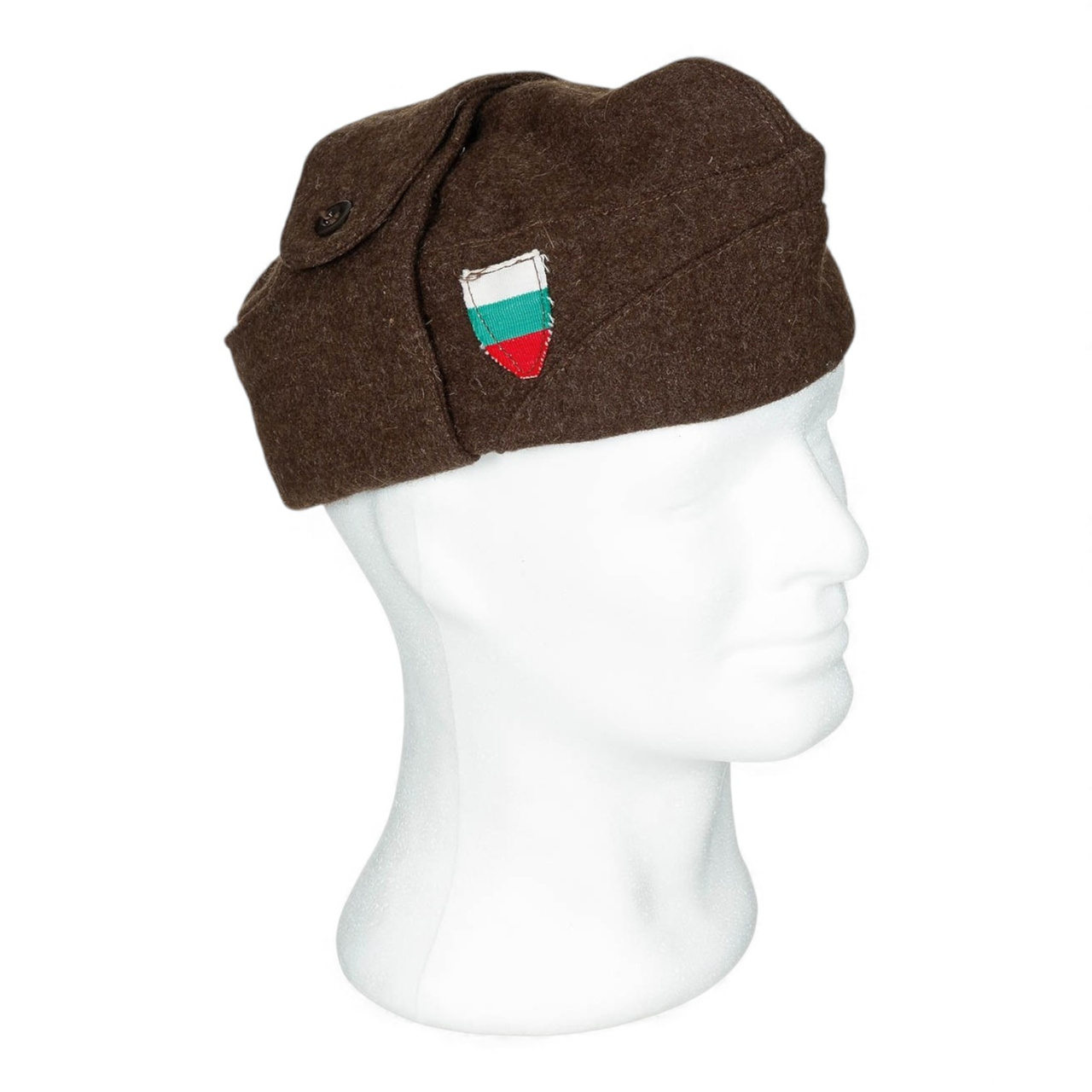Original side cap from the former army of the People's Republic of Bulgaria, dating from the 1970s to 1980s, used for service in non-operational areas. Made of thick brown wool, lined with cotton, and featuring foldable ear flaps, this item provides effective protection against the cold. The front is decorated with a sewn Bulgarian tricolor emblem.