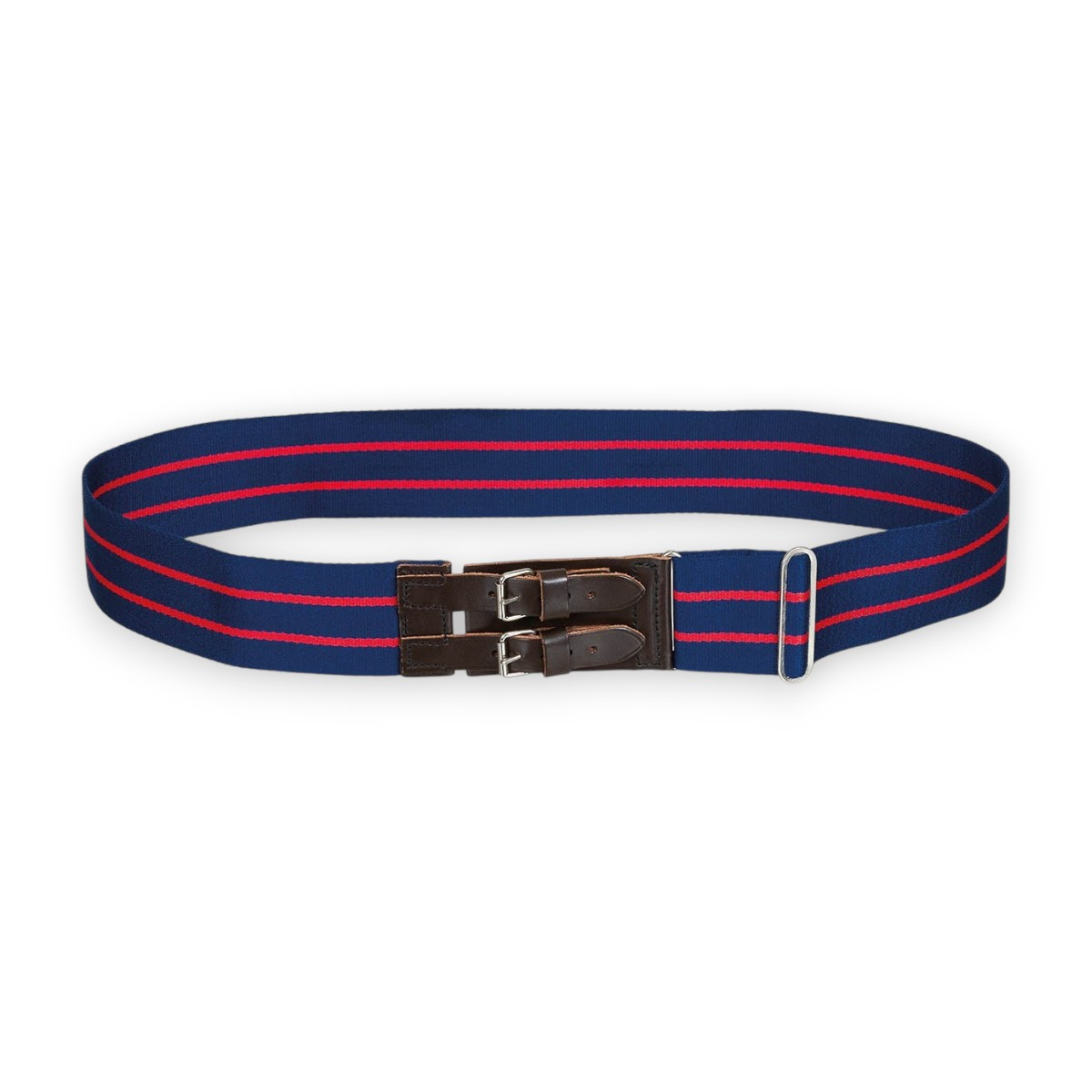 Made from durable canvas with leather inserts and metal components, this Royal Anglian Stable Belt features two adjustable leather straps, a solid metal buckle, and a nickel adjustment slider.