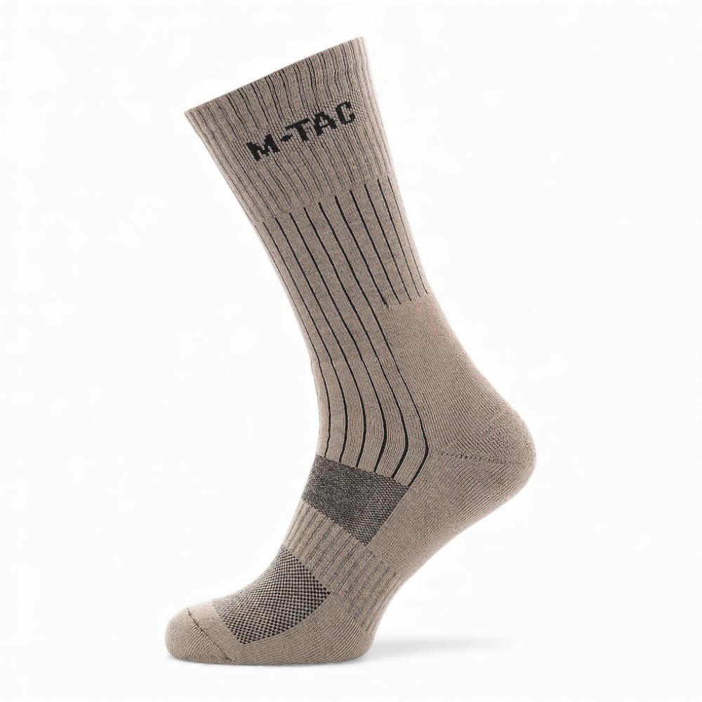 The design of the M-Tac high socks features special thermal zones and shock-absorbing areas on the front of the foot and the heel, transitioning to the arch, which protects the ankle from sprains and mechanical stress. To enhance performance during intensive walking, a lateral arch support has been added, preventing the sock from bunching up in the lower area. The wide cuff distributes pressure evenly, keeping the sock securely in place on the shin.