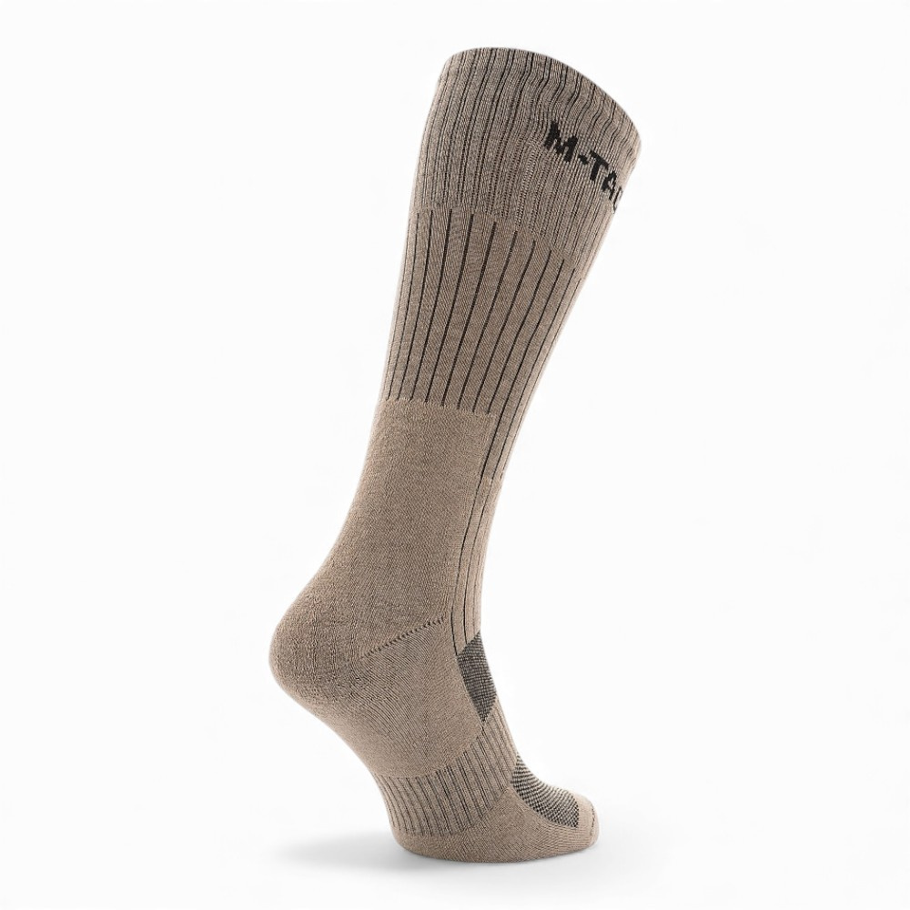 The design of the M-Tac high socks features special thermal zones and shock-absorbing areas on the front of the foot and the heel, transitioning to the arch, which protects the ankle from sprains and mechanical stress. To enhance performance during intensive walking, a lateral arch support has been added, preventing the sock from bunching up in the lower area. The wide cuff distributes pressure evenly, keeping the sock securely in place on the shin.
