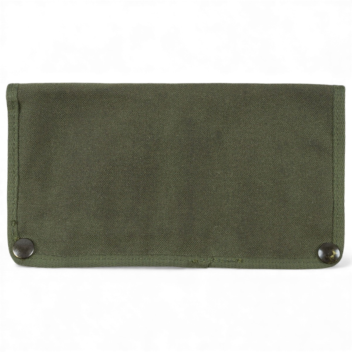 Robust bag made of high-quality canvas for a gun cleaning set, originating from British military surplus. Ideal for transport and storage, in olive green, used, with authentic character.
