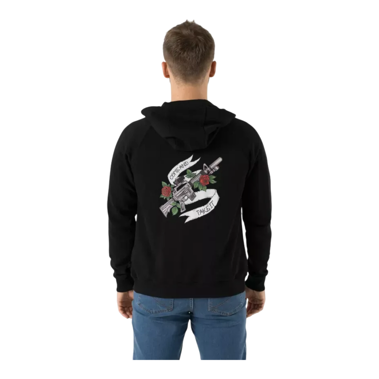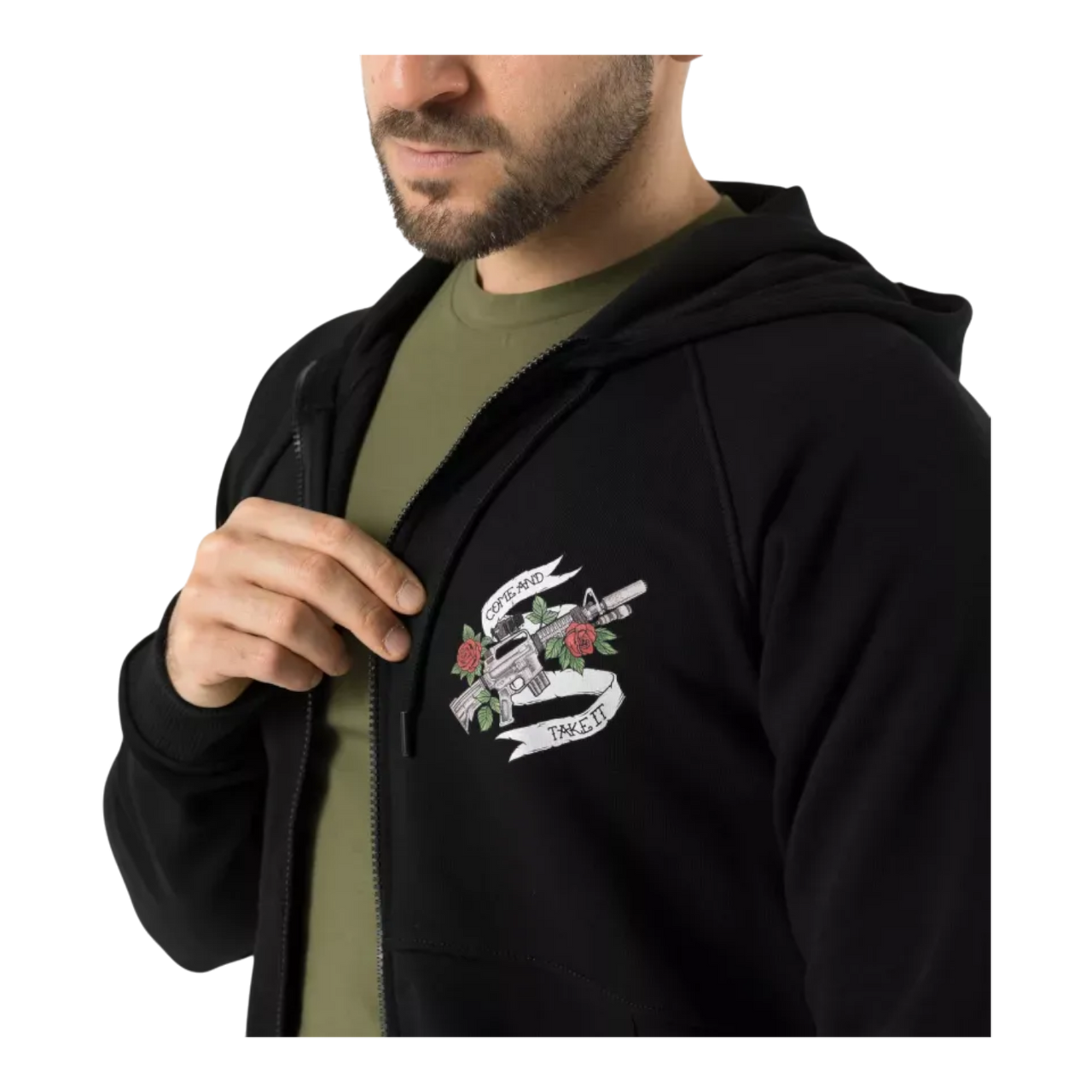 Made by Polish manufacturer Helikon-Tex®, the hoodie is made from a blend of 65% cotton and 35% polyester, offering the perfect balance between breathability, durability, and comfort. It fastens with a sturdy center zipper, and the colorful "Come and take it" print is applied to the chest and back for a distinctive look.
